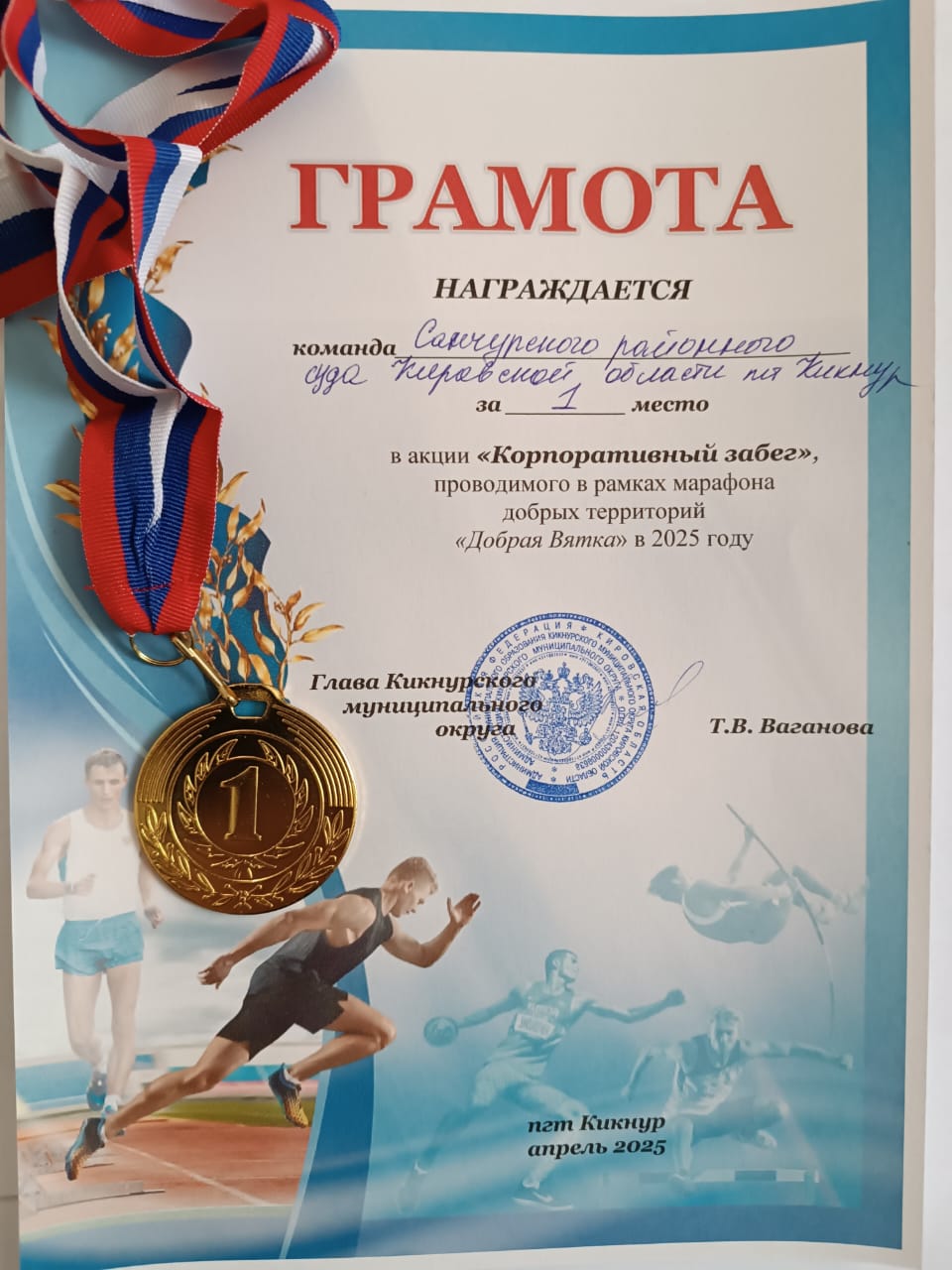 11.04.2025 в рамках марафона добрых территорий «Добрая Вятка» в Кикнурском муниципальном округе Кировской области прошла акция «Корпоративный забег». В соревнованиях принимали участие трудовые коллективы (от 2-х человек – сотрудников одной организации) Кировской области. Целью акции было повышение корпоративной культуры, укрепление командного духа. Забег способствует сплочению коллектива, улучшению взаимодействия между сотрудниками, улучшения здоровья и физической активности сотрудников; поощрение активного образа жизни. В соревнованиях принимали участие команды суда, пункта полиции, пожарной части и ДЮСШ пгт Кикнур. От Санчурского районного суда (пгт Кикнур) в акции принимали участие главный специалист суда Сырчина Г.И. и секретарь судебного заседания Коптелова К.В. По итогам соревнований 1 место разделили команда Санчурского районного суда и команда пожарной части МЧС пгт. Кикнур.